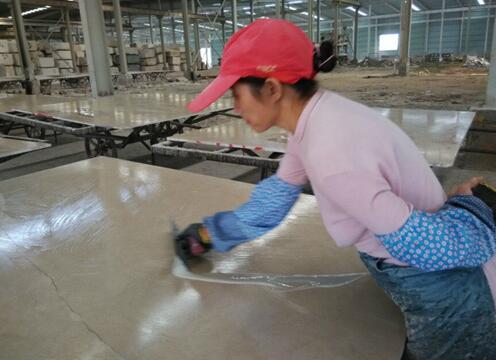 3.施胶:将混合好的胶水倒在石材面板上,用刮刀来回刮涂,如有重大缺陷,应先将土层去除,再用胶和石粉调匀修补缺陷,待胶固化后打磨,再刮涂面板。冬季气温较低时可以对胶水和板材进行适当的加热,然后再进行施胶。