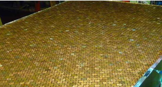 ③将硬币平铺在台面上,确保它们彼此之间紧密相邻的。如果想要摆出一些独特图案,那么可以考虑利用硬币色差来排列,而不是用正反面来区别,因为从整体看这差别很难被发现,用相似颜色的硬币组合出的图案则非常清晰。