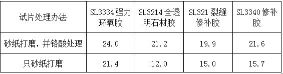 我们需要准备的材料有:浓硫酸、蒸馏水、丙酮、重铬酸钾或重铬酸钠、LV12CZ试片、胶粘剂、60-180目砂纸、胶接定位夹具、烘箱、温湿度计、纸巾、棉签、玻璃棒、长镊子、干净的烧杯、不锈钢托盘或搪瓷托盘、药物天平或电子天平。 这里要提醒大家的是,如果是室温固化的胶,应将胶粘剂和以上这些材料提前一天放置在实验室,并将实验室温度调节到23±2℃。 铬酸试片处理具体步骤:提前配制好铬酸氧化液、砂布打磨试片、试片用铬酸阳极化处理、清洗、烘干、干燥备用。 我们用几款世林的环氧类型胶粘剂,做了铬酸处理和不处理的试片在室温固化24小时胶接剪切强度对比,数据如下