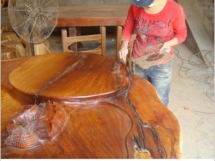大板(柚木、花梨木、鸡翅木、檀木等)在修补前,首先应将大板里的水分风干,好把木材内的含水量控制在6%-12%之内,并且要将有缝隙和裂纹处的泥沙木屑清理干净再进行灌胶或涂胶修补,如果裂缝处底部是相通的,则需要将底部先堵住,待补完胶再打磨掉。这样修补出来的成品才相当平整和美观.