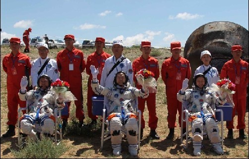2012年06月29日上午10时,神九载人飞船返回舱在内蒙古主着陆场安全着陆,3名航天员身体状况良好。天宫一号与神舟九号载人交会对接任务取得圆满成功。
