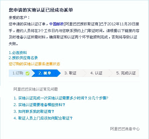 世林胶业在阿里巴巴诚信通会员历经九年了,谢谢阿里巴巴平台给世林胶业的支持.2012年11月底世林胶业进行了实地认证申请,阿里巴巴的认证效率非常之高,详情请看下图: