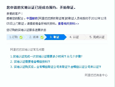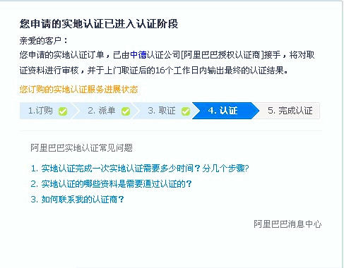 阿里巴巴实地认证服务分为取证与认证两个环节,取证服务有特定的取证商:中国邮政和中诚信;认证服务有特定的认证商:中诚信,杭州中德,北京汇华。如果你那的材料齐全,在上门取证后的16个工作日内会有认证结果(认证成功或认证失败),并且到时会有旺旺浮出提醒。