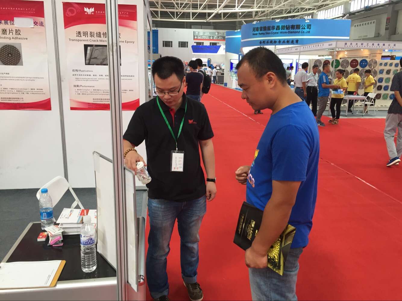 世林胶业是一家专业研制和生产各种石材胶和磨具磨料专用胶的厂家,其产品具有强度高、耐黄变、耐老化、收缩小、渗透强等特点,主要应用在台板复边、拼花、裂缝修补、磨具磨料上。很多客商对我们世林全透明石材胶系列非常感兴趣,完全透明清澈如水的液体适合对各种颜色的石材进行修补,渗透性强的特性又能有效的修复裂缝、小孔洞、砂眼、蚂蚁路孔洞等现象。展会上很多客商当场就向我们订购全透明石材胶,包括我们展会上的石材胶样品都被客户买回去做测试。