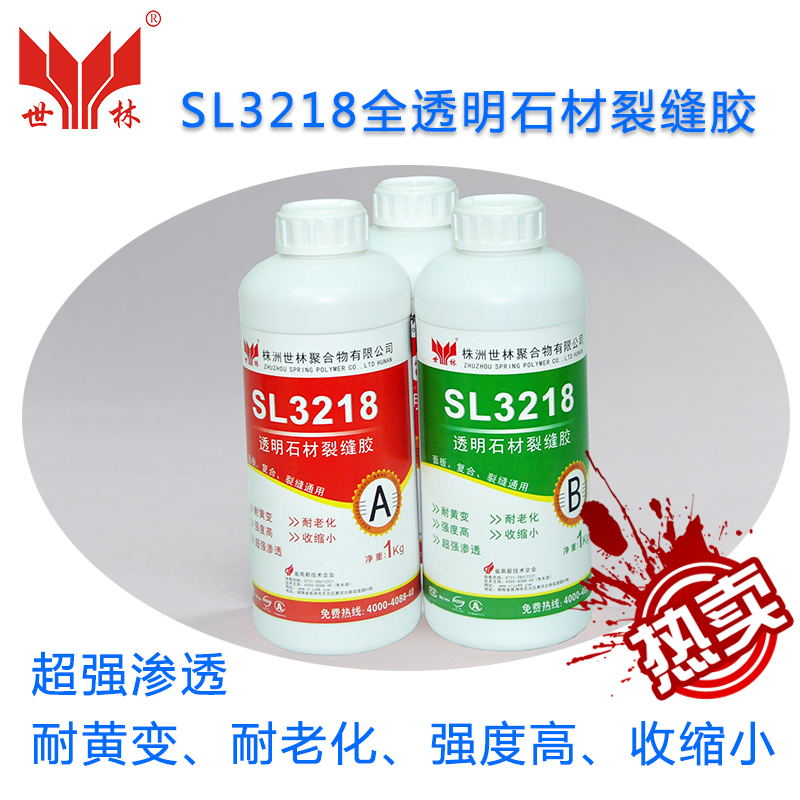 世林胶业有一款SL3218全透明石材裂缝胶,适用于浅色石材裂缝、裂纹、砂眼、疏松、小孔洞、蚂蚁路等缺陷修复。它具有以下性能特点:1.固化速度较快;2.渗透力强;3.无色透明、光泽度较好、硬度高;4.固化后收缩较小; 5.操作方便; 6.耐磨、耐老化;7.有良好的耐候性、耐稀酸、耐稀碱、耐水;8.适合各色板材裂缝修补; 9.无毒、环保等特点。