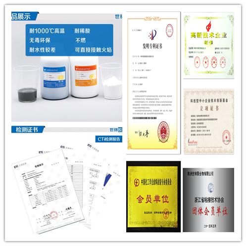 株洲世林胶业生产的SL8301耐1000℃无机高温胶,它是一种需要高温固化的双组份胶粘剂,具有阻燃、耐温性好、固化后有一定的胶接强度和密封作用,使用方便。主要用于耐高温部件的密封和胶接(初固),其工作温度从-40~+1000℃。 短时可达+1200℃。不仅用于高温炉体修补还可以用于高温陶瓷、灯头、金属密封。