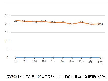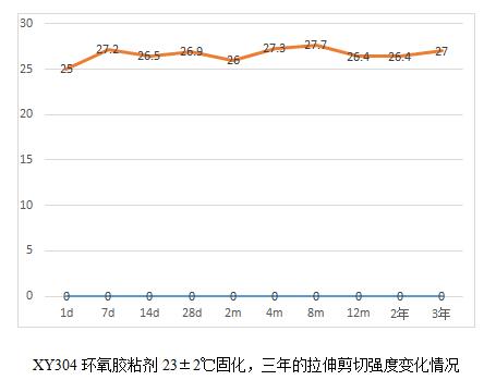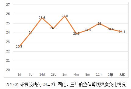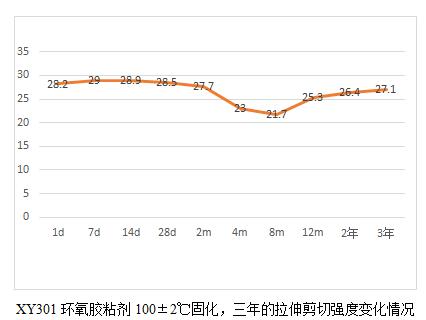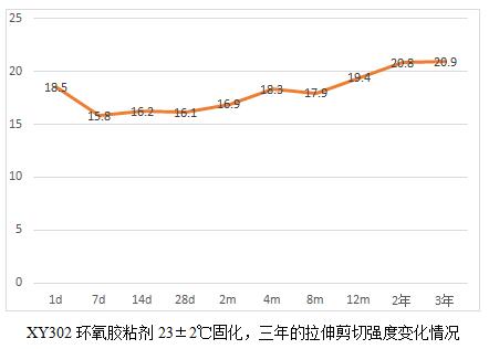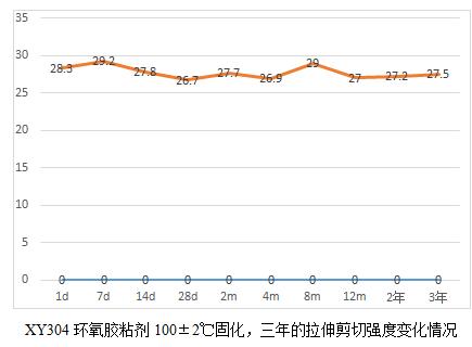 当然通过这6个表,我们也能看出规律就是,胶粘剂产品高温固化相对较为完全,后续老化数据影响不大,而常温固化数据明显低于高温固化,比如XY304,常温固化数据未25兆帕,高温固化为28.3兆帕,而XY301室温固化数据22.5兆帕,高温固化为28.2,相比高出25%。