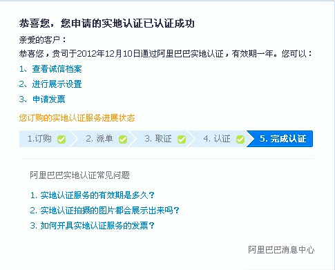 世林胶业在阿里巴巴诚信通会员历经九年了,谢谢阿里巴巴平台给世林胶业的支持.2012年11月底世林胶业进行了实地认证申请,阿里巴巴的认证效率非常之高,详情请看下图: